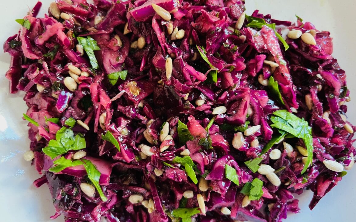 Sind die Temperaturen tagsüber noch angenehm, mag ich es, saisonale Zutaten in kalt / Rohkost mit warmen zu kombinieren. In diesem Rezept ist dies ein Rohkost-Rotkohlsalat mit warmen Kürbisspalten.