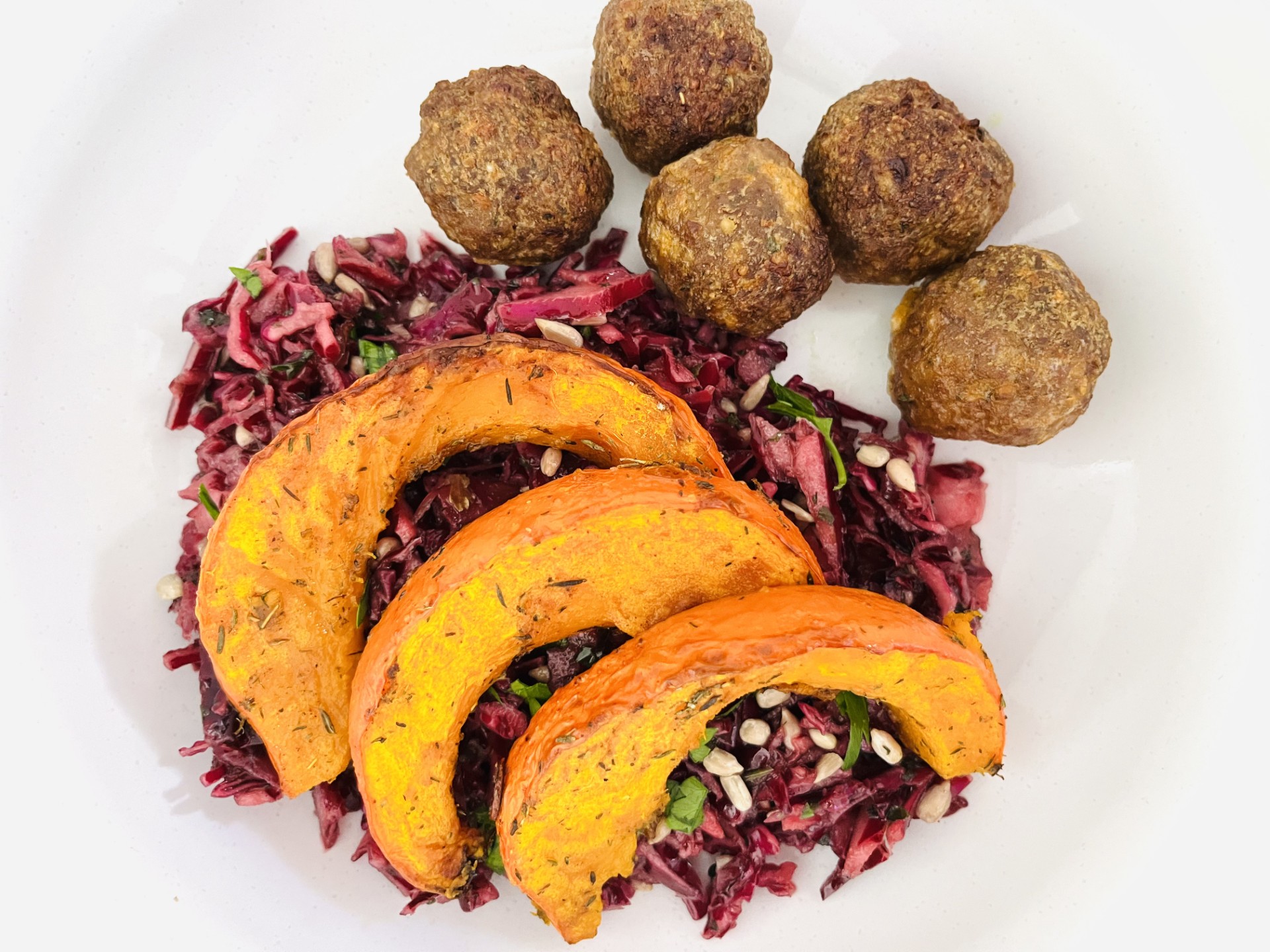Den Salat auf Tellern verteilen. Die Kürbisspalten darüber legen. Die Hack-Bällchen daneben plazieren.
