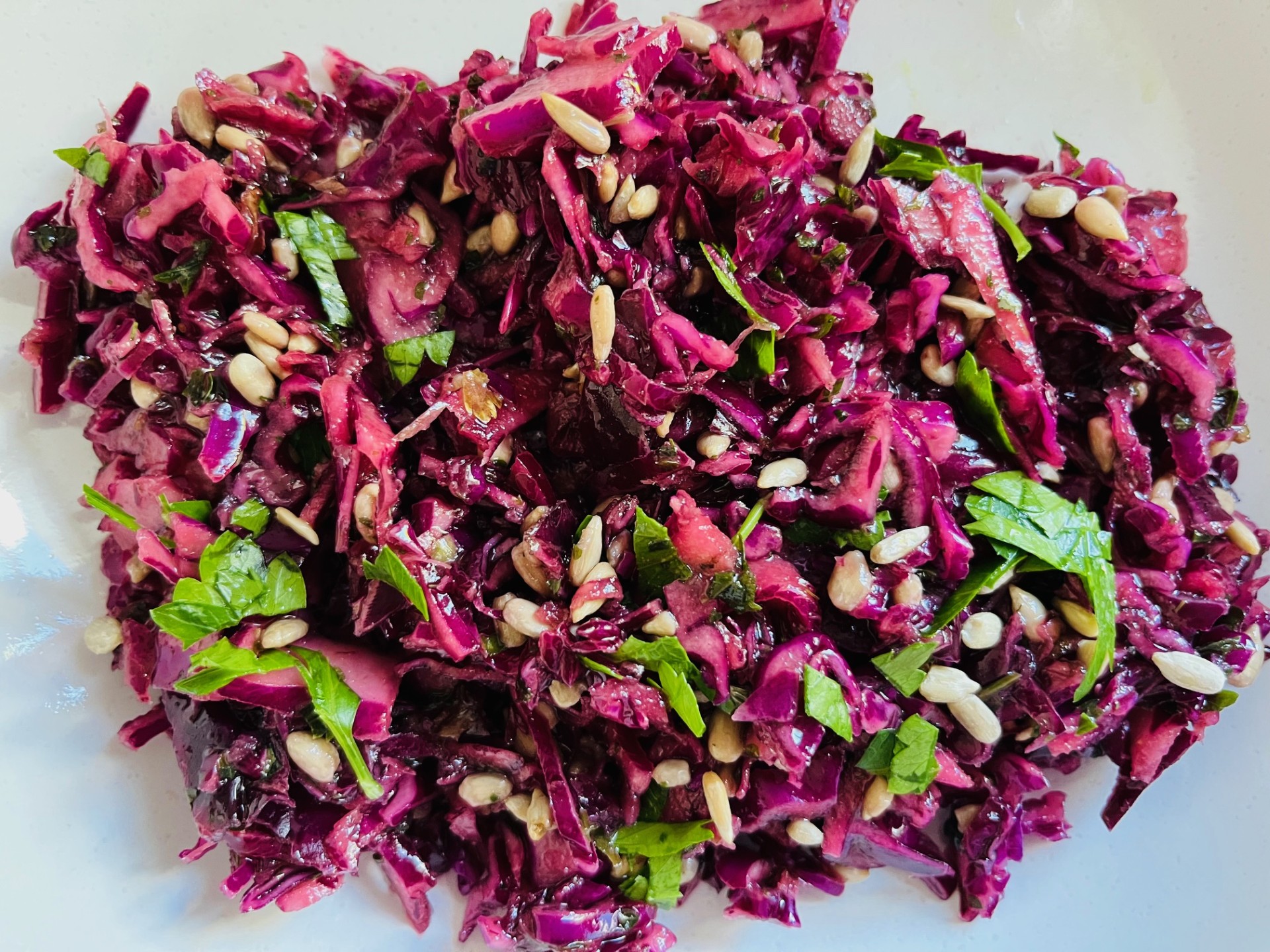 Sind die Temperaturen tagsüber noch angenehm, mag ich es, saisonale Zutaten in kalt / Rohkost mit warmen zu kombinieren. In diesem Rezept ist dies ein Rohkost-Rotkohlsalat mit warmen Kürbisspalten.